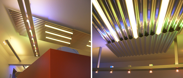 Praxis Beurich Die verschiedenen Zonen mit unterschiedlichen Raumhöhen und Raumfolgen dieser Arztpraxis sind durch eine Beleuchtung aus Aluminiumprofilen und Aluwell-Tafeln direkt und indirekt beleuchtet. Der Rezeptionsbereich ist durch das Deckenpaneel mit teilweise farbiger Indirektbeleuchtung akzentuiert.