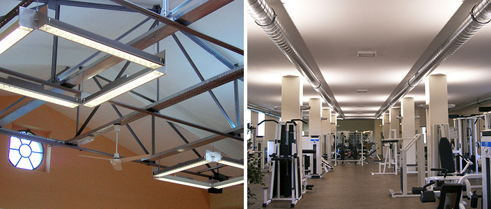 Fitness-Studio Der Gerätebereich wird durch Deckenfluter gleichmäßig hell beleuchtet. Die Randzonen mit Tageslichteinfall und die Kernzone sind getrennt schaltbar. Im Freihantelbereich, der sich in eine ehemaligen Industriehalle befindet, wird der Dachraum mit den Dreiecksbindern indirekt mit Tageslichtfarbenen Leuchtstofflicht aufgehellt.