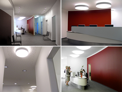 Kardiologie Brühl u. Bergheim Die zwei Praxen der Praxengemeinschaft sind nach gleicher corporate identity gestaltet. Die Rezeption in Brühl befindet sich direkt am Eingangsbereich mit viel Tageslicht. Die Deckenleuchten sind für Tag/Abend mit unterschiedlichen Lichtfarben schaltbar. Die verschiedenen Funktionszonen werden durch Wallwasher über die Wand beleuchtet oder runde Deckenaufbauleuchten differenziert.