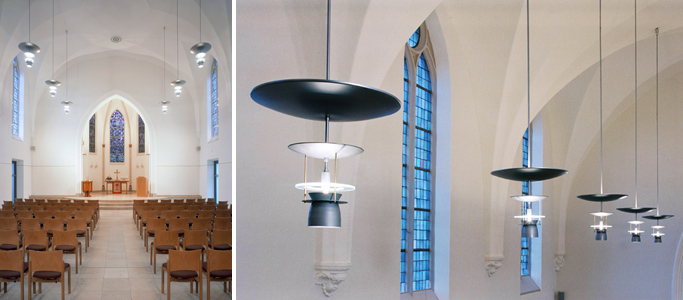Ev. Kirche Ketzberg Bei der Generalsanierung dieser Kirche wurde eine Leuchte entwickelt, die es ermöglicht, mit direktem Licht eine ruhige, gedämpfte Stimmung zu erzeugen oder durch Indirektbeleuchtung eine helle, feierliche Atmosphäre zu schaffen. Die Apsis kann zusätzlich indirekt beleuchtet werden. In den Laibungen der vorderen Fenster befinden sich Strahler zur Ausleuchtung des Altarraums. Bilder © Sigurd Steinprinz