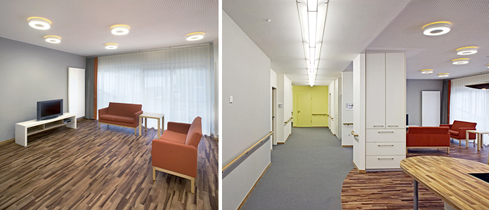 Um Situationen und Räume besser erkennen zu können, benötigen Menschen mit Demenz helles Licht. Ausreichende Lichtquellen sollen Schattenbildungen verhindern und Wege gleichmäßig ausleuchten. Die Bewegungszonen der Flure sind mit linearen Lichtbändern kontrastarm und schattenfrei beleuchtet.